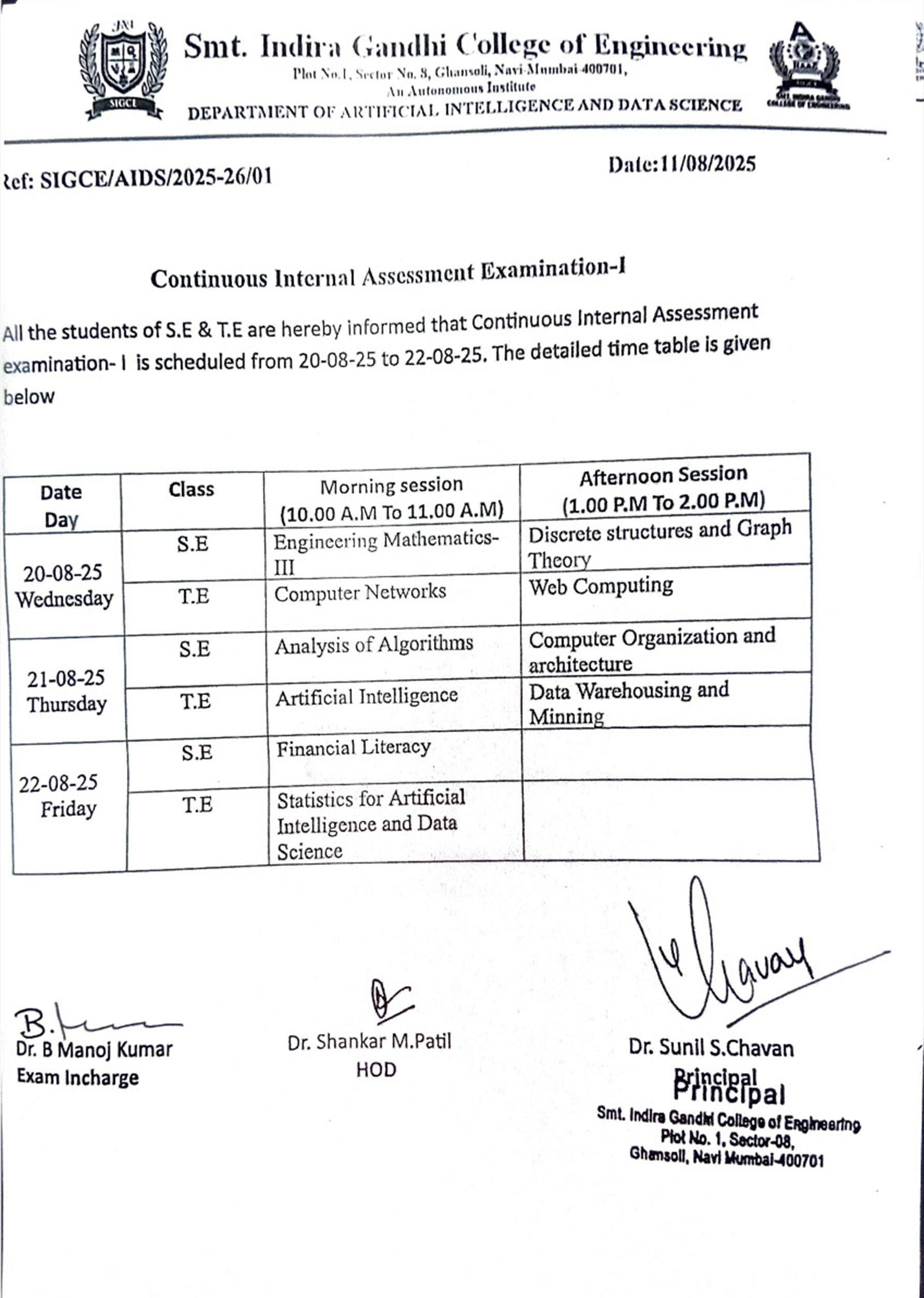 | 11/08/2025 | Continuous Internal Assessment Examination-1 | Click Here |